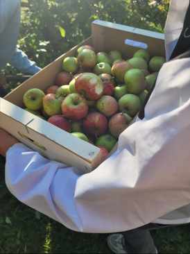 Hier können sich die 7. Klassen bei der Herstellung von Apfelsaft beweisen. Auch meine Klasse war in diesem Jahr mit viel Tatendrang dabei. Zunächst ging es in kleinen Gruppen von 5-6 Personen in unseren Gymnasiumpark. Dort haben wir fleißig Äpfel gepflückt und eingesammelt. An der nächsten Station wurden die Äpfel geschnitten. Dazu waren wir an mehreren Tischen versammelt und mit Schneidemessern, Körben und Schneidebrettern ausgerüstet. Die fertigen Apfelstückchen wurden später in die Apfelpresse gegeben und schrittweise zu Apfelsaft verarbeitet.